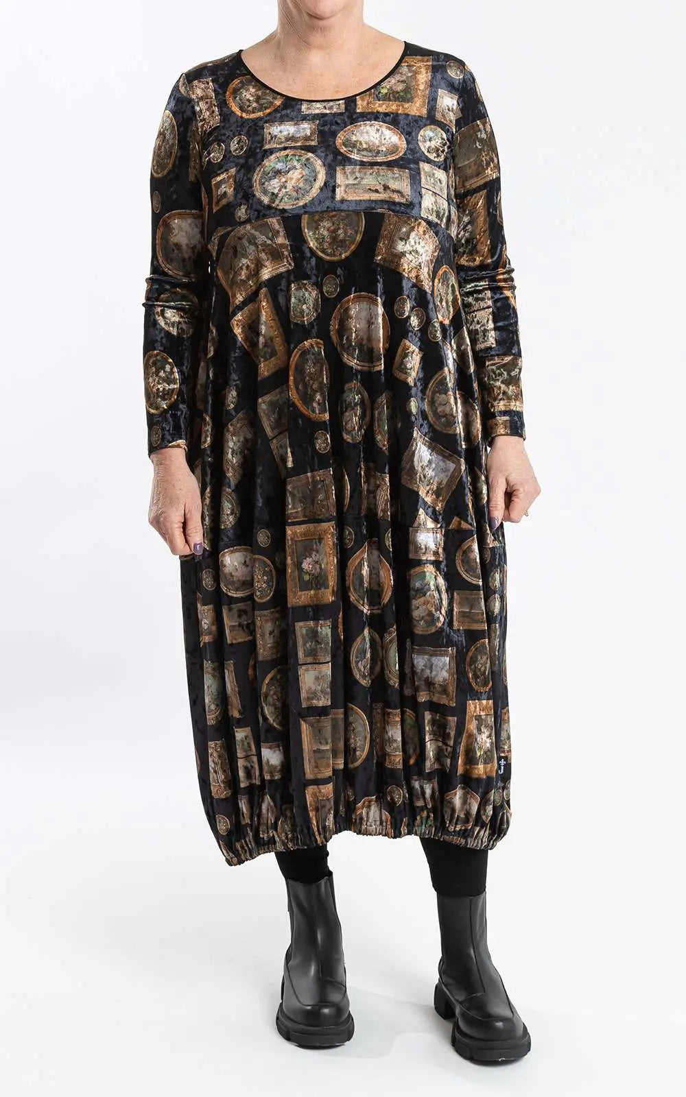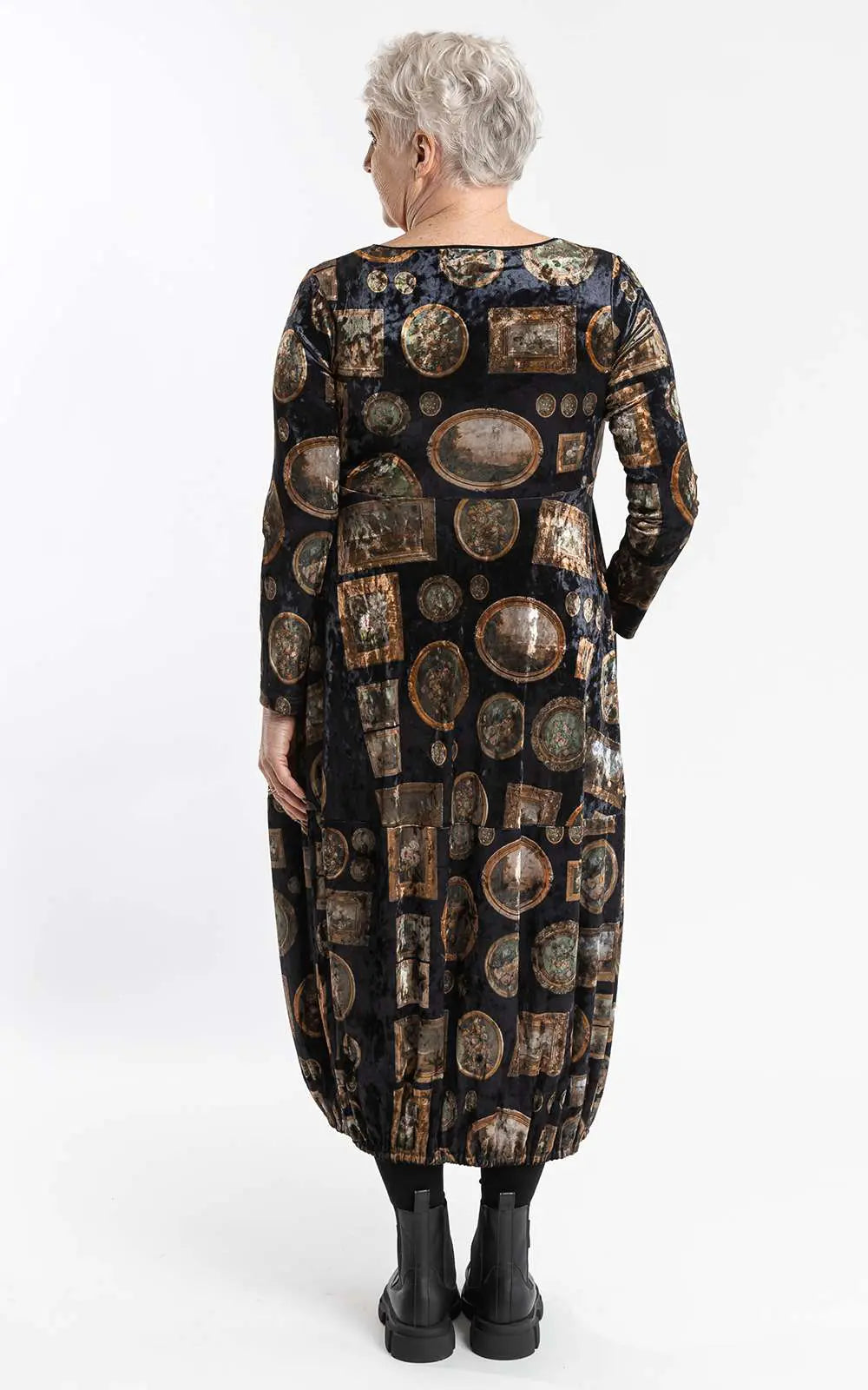 Our popular velvet balloon dress. Hangs and pulls in at the bottom. This style is a favourite with many. A well known velvet loved by all fabric. Fabric designed and printed by Jellicoe.