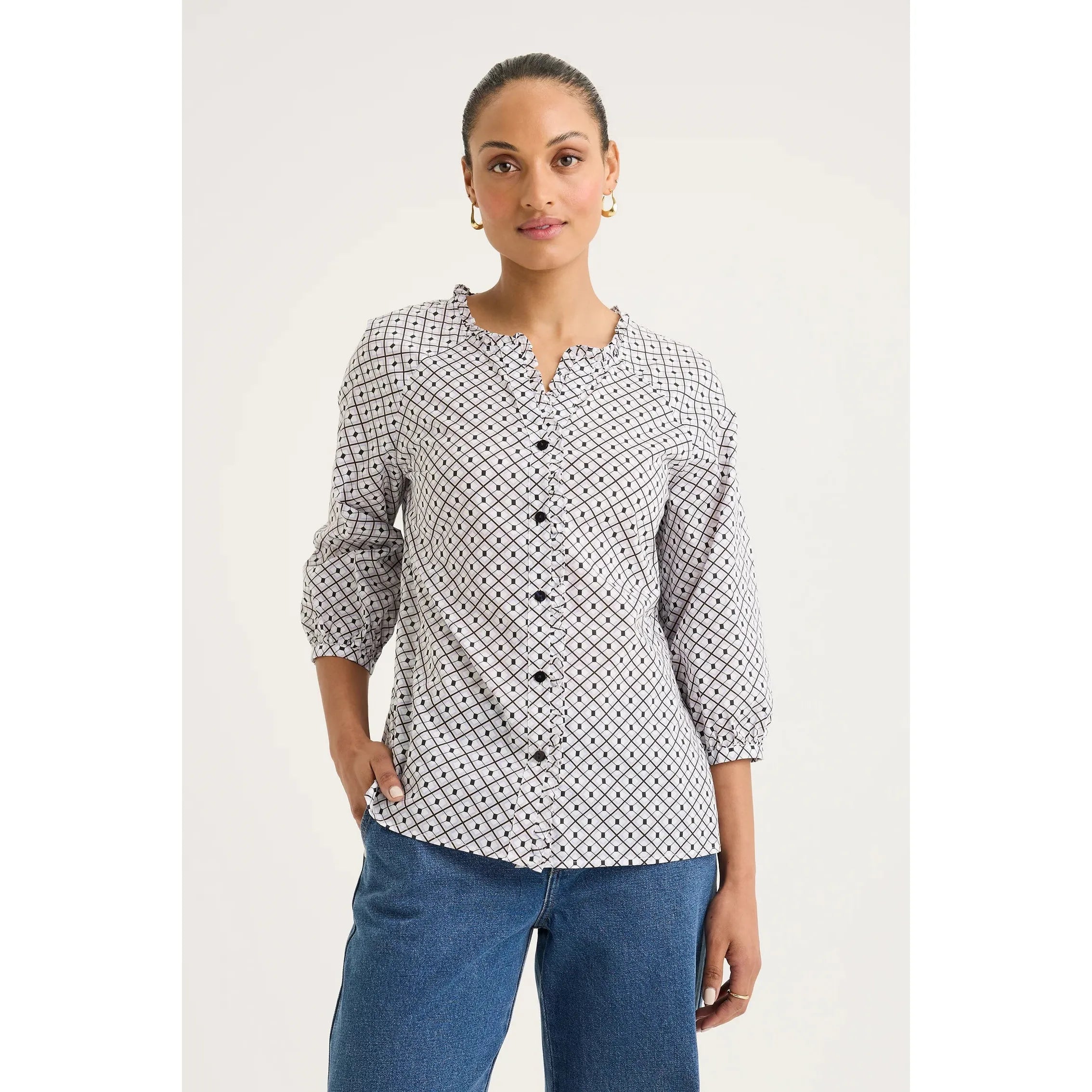 The Basalt Top is a beautiful blend of modern design and feminine details. Featuring a cut-away round neckband and the exclusive ‘Basalt’ print, it adds a unique touch to your wardrobe. The frill trim enhances the neckline, while the semi-gathered ¾ length sleeves with bands create a relaxed yet polished look. The front placket with button-through detailing adds a classic finish to this effortlessly chic piece. With its regular fit, the Basalt Top is perfect for pairing with jeans, skirts, or trousers for versatile styling options.