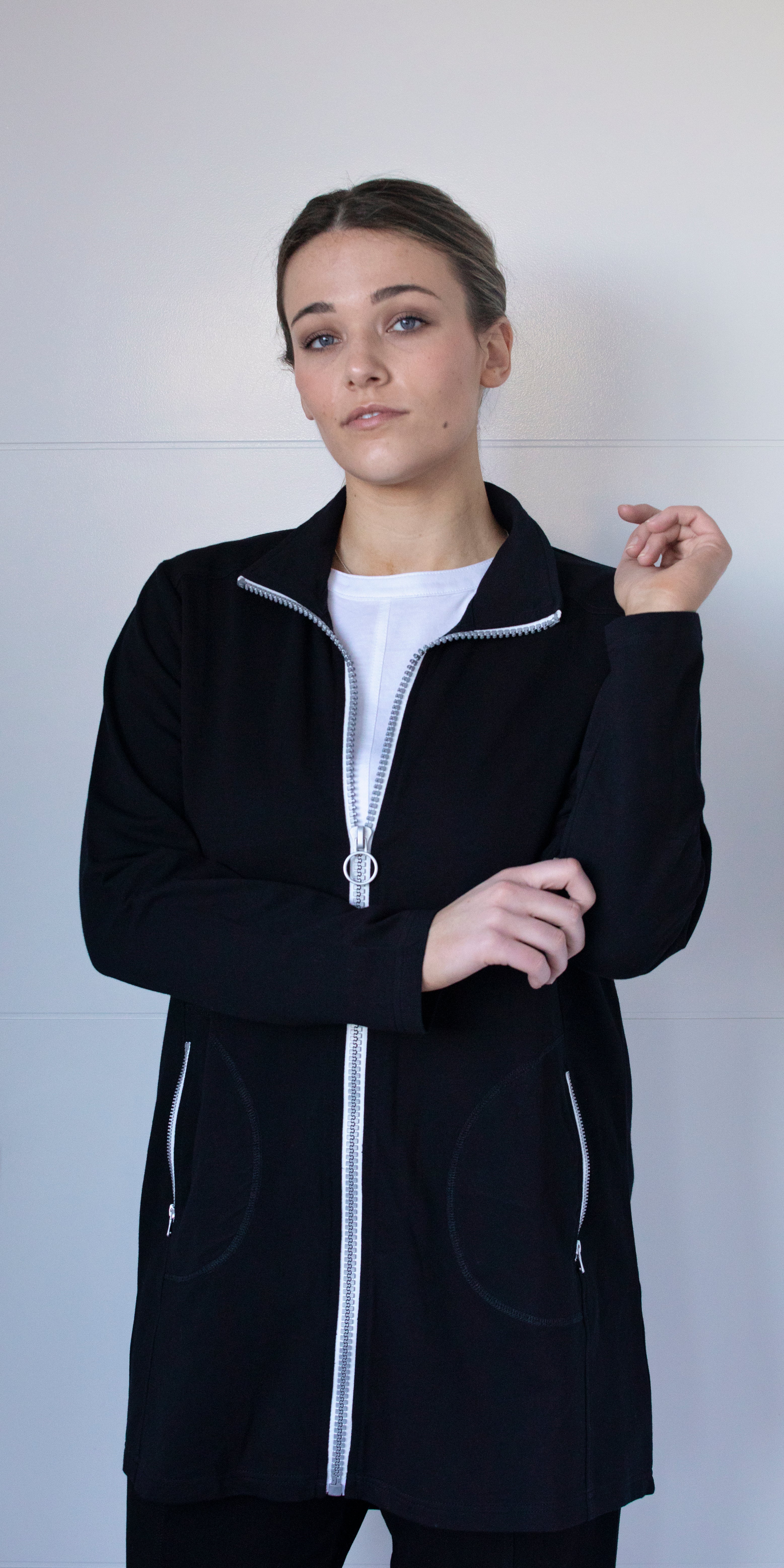 Introducing the White on Black Long Sweat Jacket, your go-to for cozy style! This jacket features a convenient zip front. With pockets for storing essentials and a relaxed fit, it offers both comfort and functionality, while its longer length provides extra coverage
