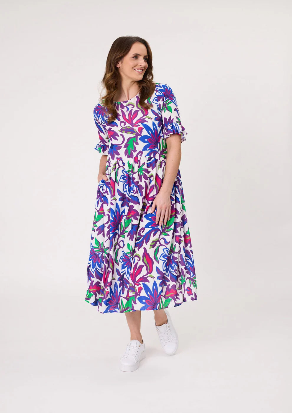 Let your wardrobe bloom this season. The Bloom Midi Dress is a statement in colour and confidence, featuring a bold floral print in vivid shades of blue, green, purple, and fuchsia. Its soft frill sleeve adds a feminine touch, while the easy midi length flatters your shape without clinging.