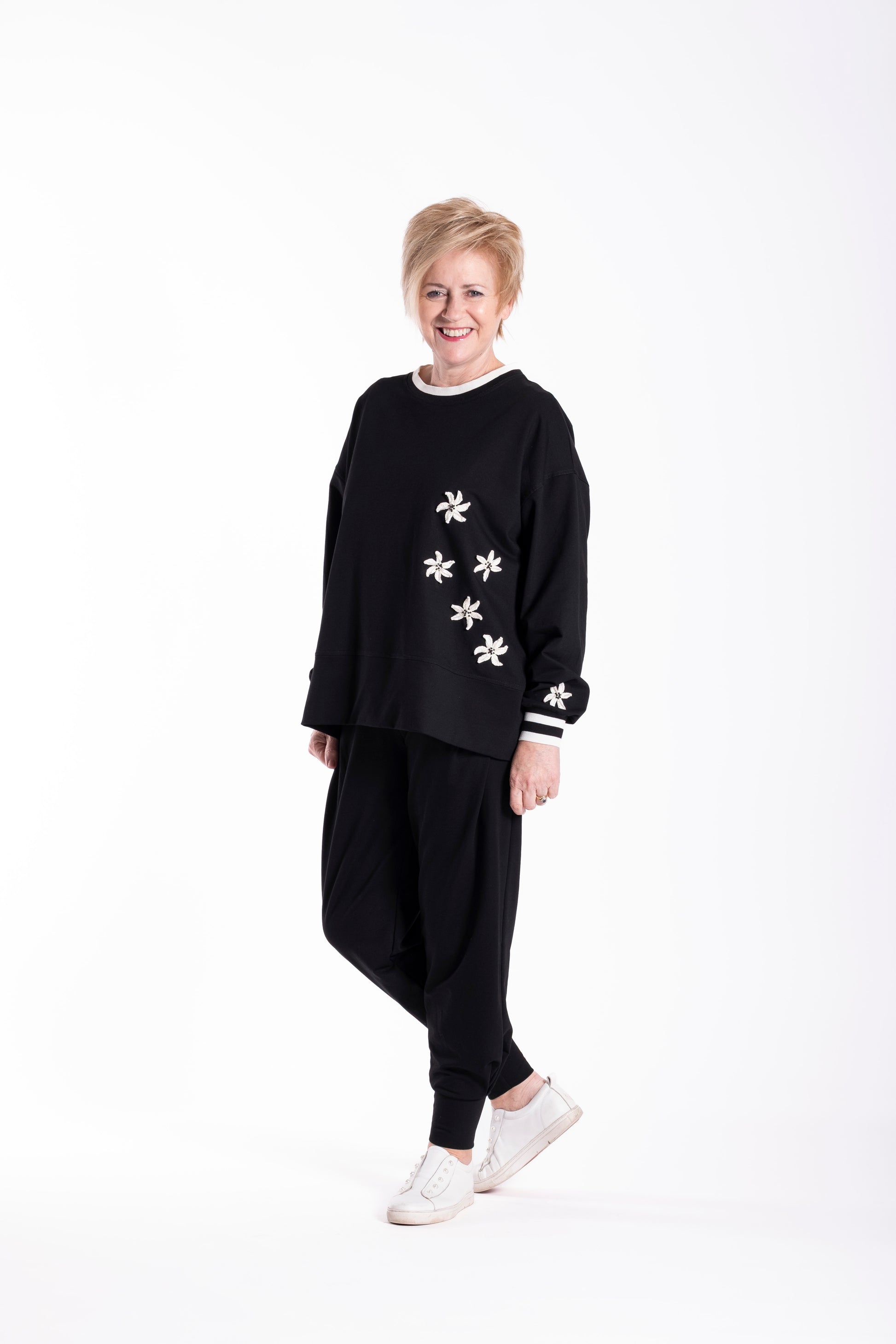 This is a relaxed women’s sweatshirt designed for everyday comfort with elevated handcrafted detail. Featuring a clean, easy-to-wear silhouette, the Bella Sweatshirt is finished with crocheted floral appliqués with beaded centres and a functional zip detail at the back, adding texture, dimension, and a subtle design statement. The combination of embellishment and zip detail elevates this casual style while keeping it comfortable and wearable.