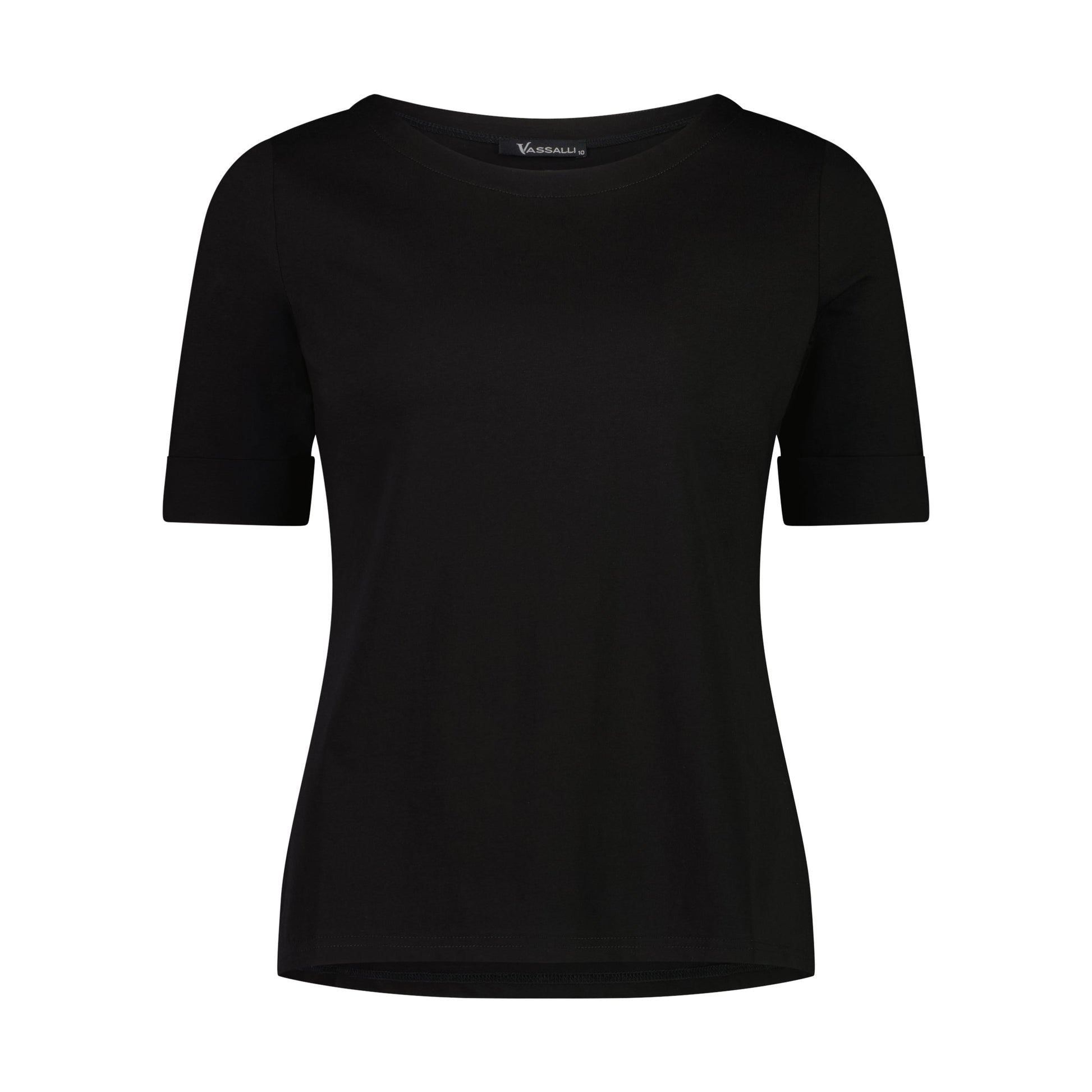 This boat-neck top is made from soft, stretchy cotton-elastane jersey for all-day comfort. It features short sleeves with turned-up cuffs, a relaxed fit, and side splits for easy movement.
