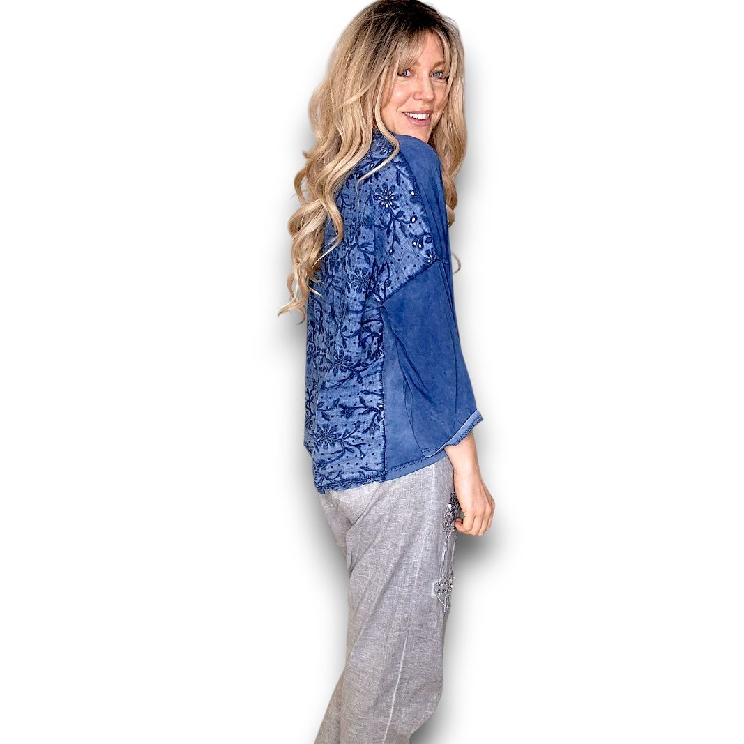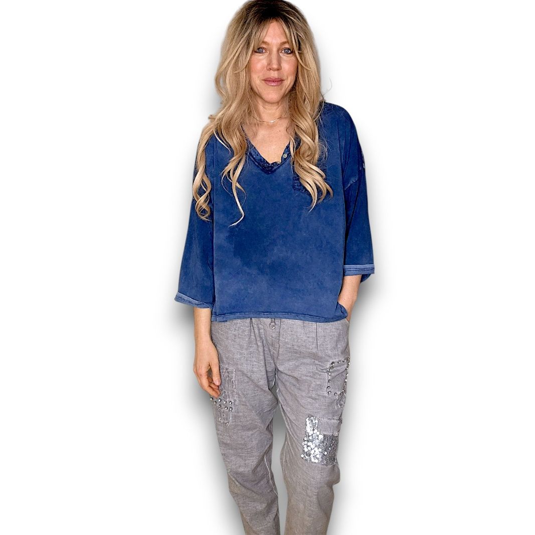 A relaxed fit, mid-sleeve tee with broderie anglaise detailing, front pocket, and pearl button neck detail.