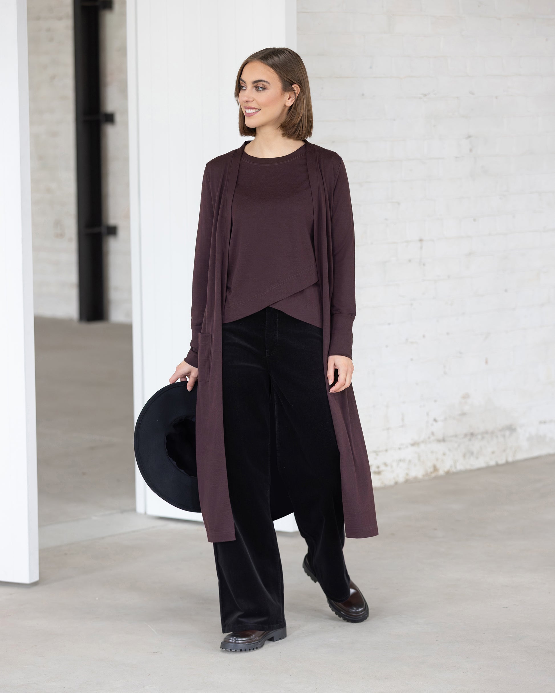 Long merino coatigan in Berry — a rich dark plum tone. Designed with an open front and a slim, streamlined fit, this style offers an easy layering piece that provides warmth without bulk.