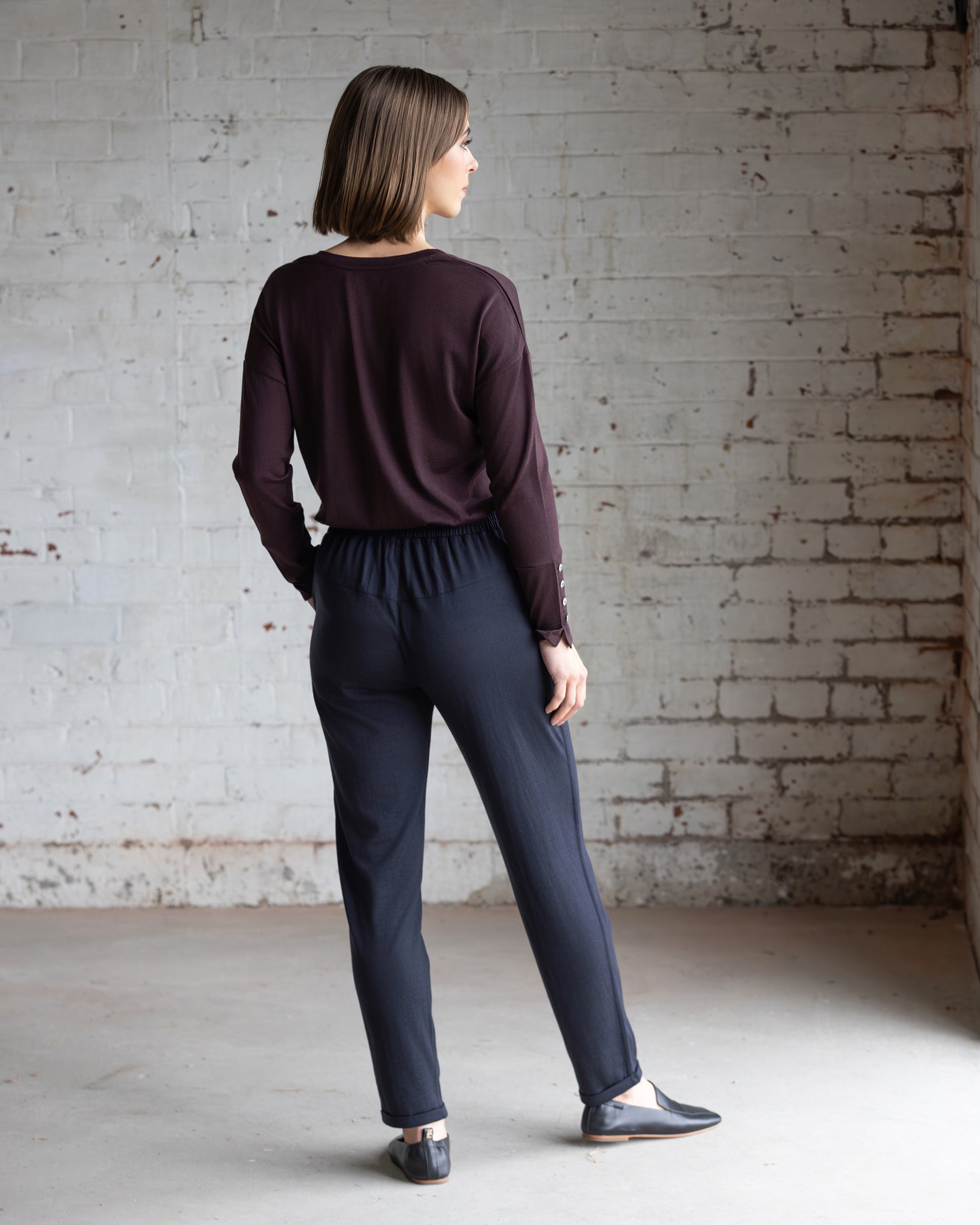Casual merino pant in black or Midnight, combining soft comfort with a clean, streamlined silhouette. With an easy pull-on fit and slim leg shape, this style delivers relaxed wearability with a polished feel.