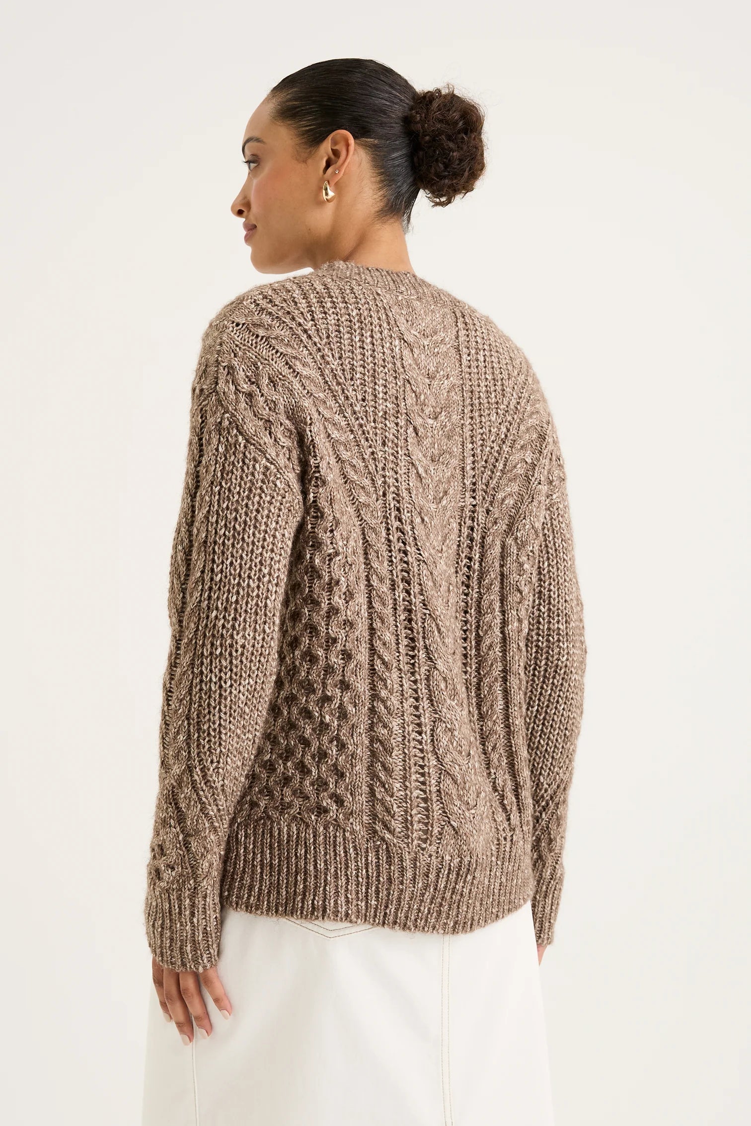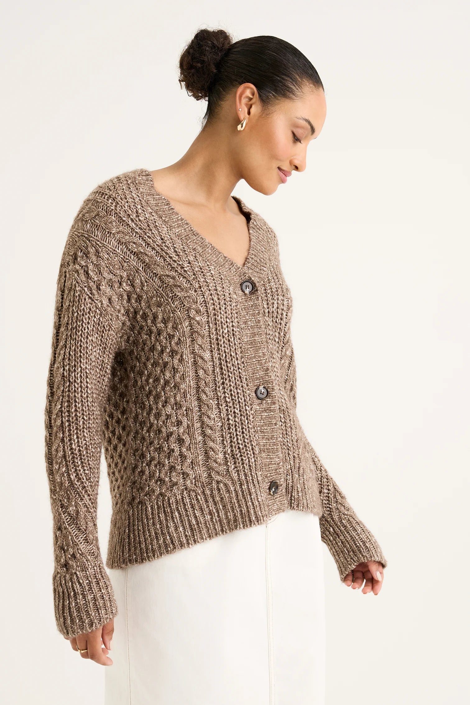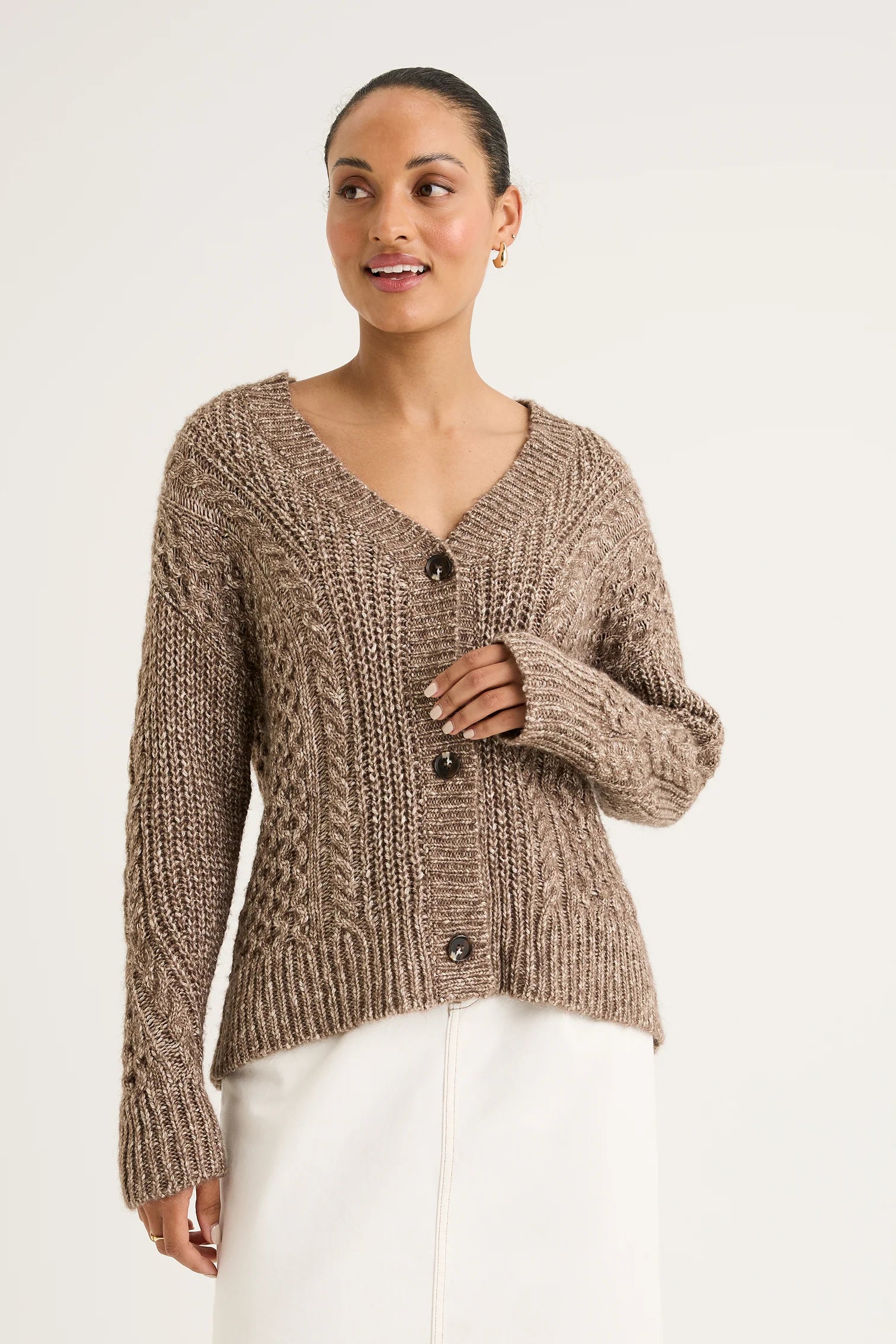 Welcome to the Gossamer Cardigan, a sophisticated and modern design with many elements. The combination of varied cable patterns creates a unique texture that enhances its visual appeal. The V-neckline, front buttons, and long sleeves ensure it’s both practical and chic, perfect for layering or wearing on its own. Pairing it with Briar Slim Leg jeans and sneakers adds a modern, fun touch to a timeless winter look
