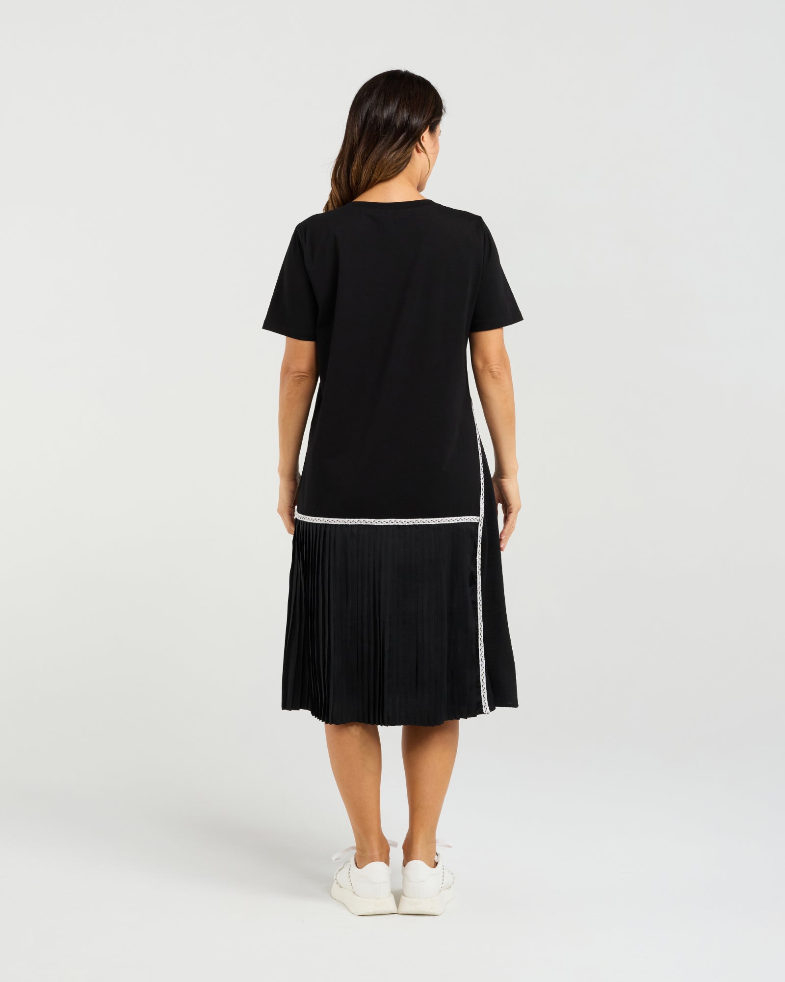 Elevated and refined, this black dress stands out with a pleated skirt panel and a fluid side split that moves beautifully. Luxurious white trims add contrast and polish, giving a modern edge to its thoughtfully designed silhouette.